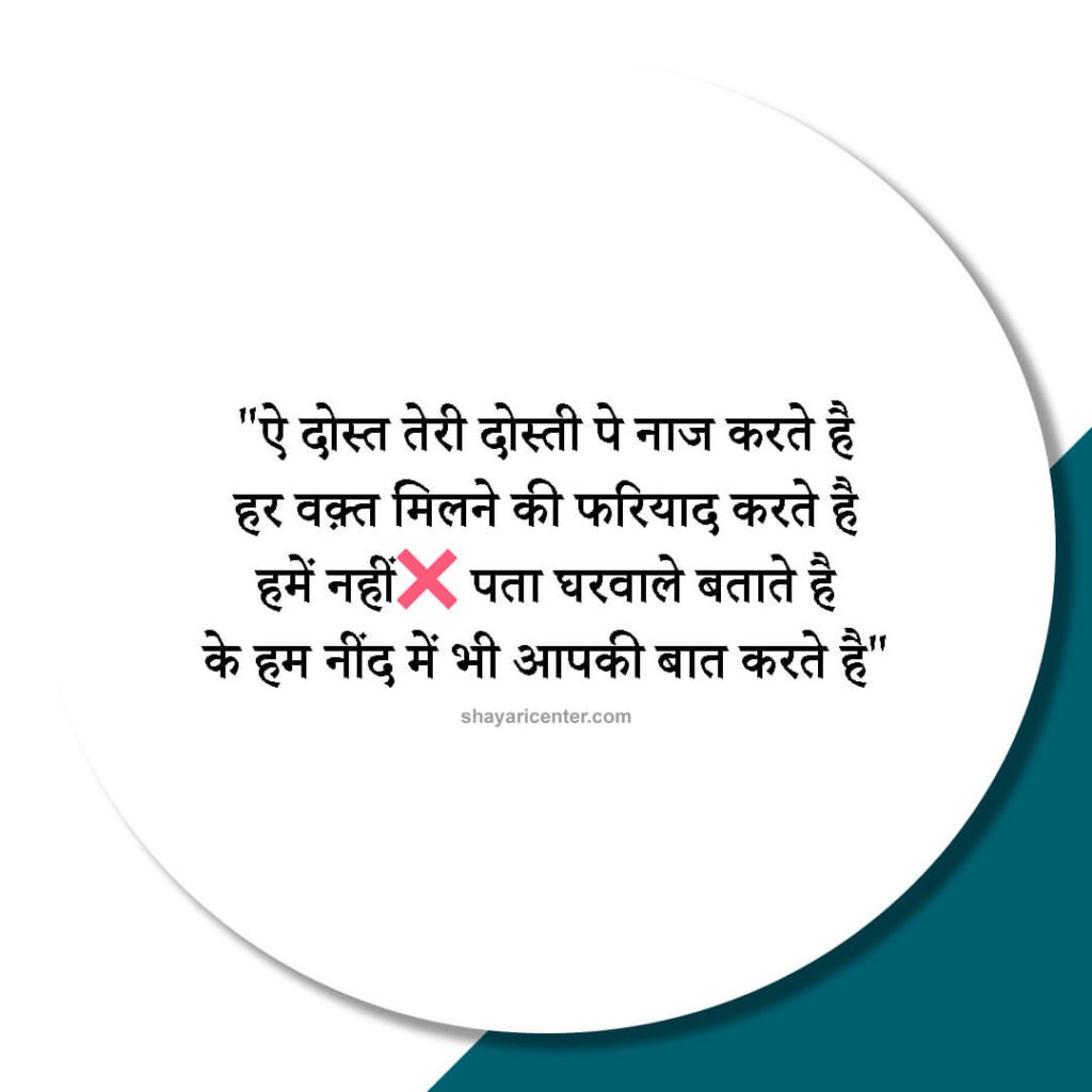 ऐ दोस्त तेरी दोस्ती पे नाज करते है हर वक़्त मिलने की फरियाद करते है हमें नहीं पता घरवाले बताते है के हम नींद में भी आपकी बात करते है