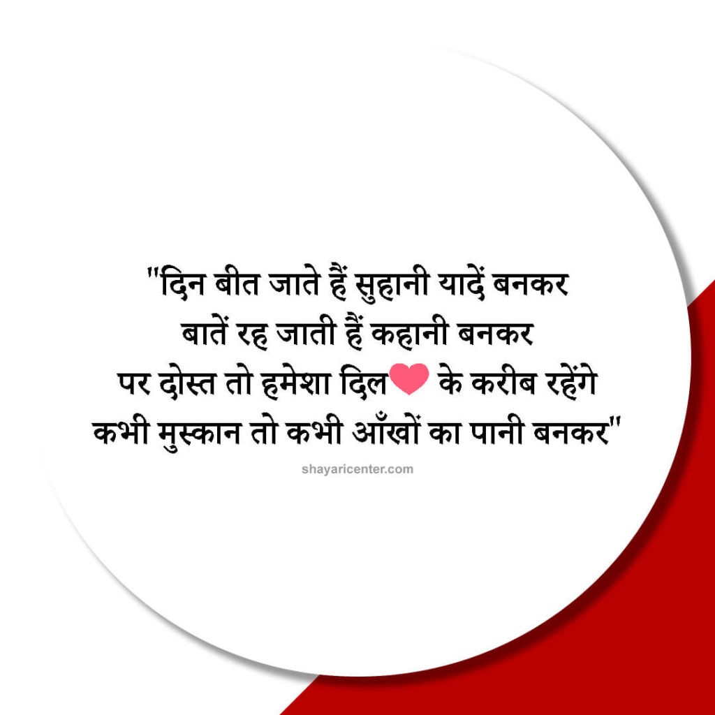 दिन बीत जाते हैं सुहानी यादें बनकर बातें रह जाती हैं कहानी बनकर पर दोस्त तो हमेशा दिल के करीब रहेंगे कभी मुस्कान तो कभी आँखों का पानी बनकर