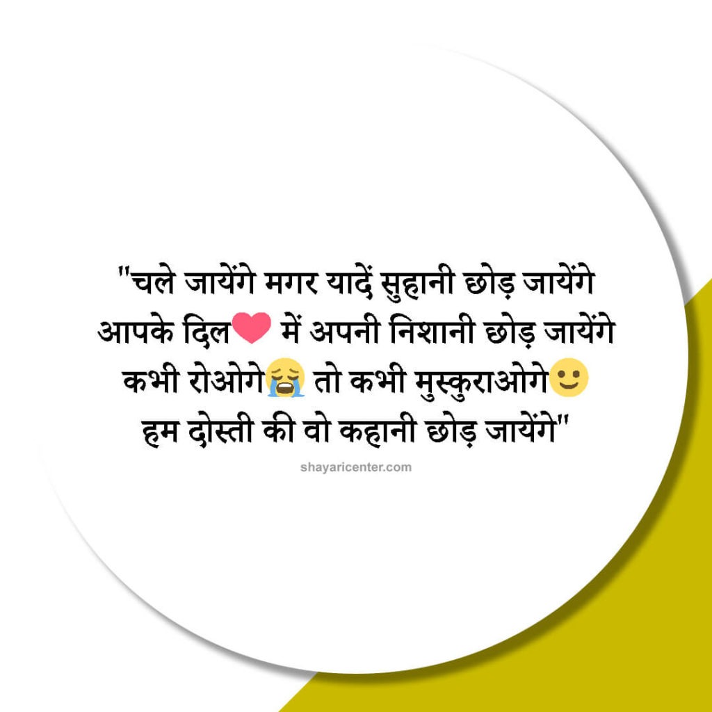 चले जायेंगे मगर यादें सुहानी छोड़ जायेंगे आपके दिल में अपनी निशानी छोड़ जायेंगे कभी रोओगे तो कभी मुस्कुराओगे हम दोस्ती की वो कहानी छोड़ जायेंगे