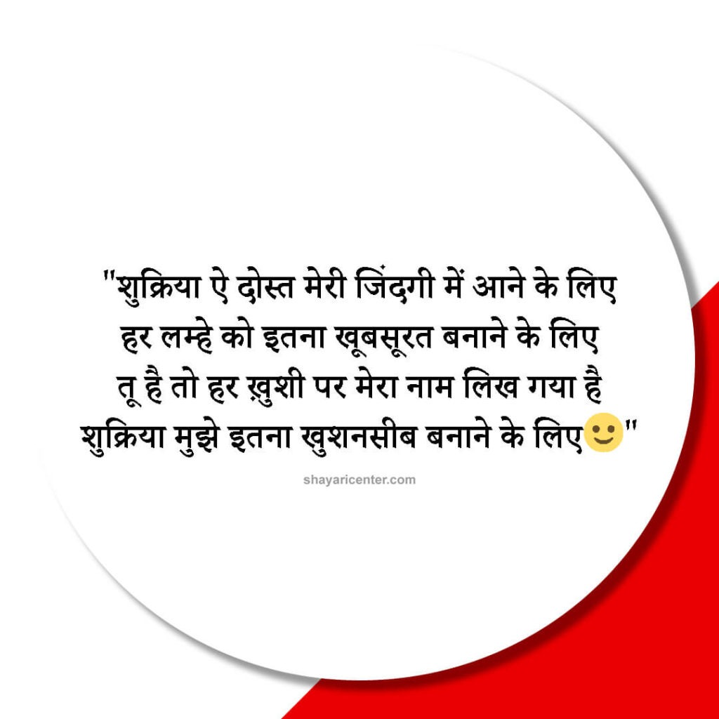 शुक्रिया ऐ दोस्त मेरी जिंदगी में आने के लिए हर लम्हे को इतना खूबसूरत बनाने के लिए तू है तो हर ख़ुशी पर मेरा नाम लिख गया है शुक्रिया मुझे इतना खुशनसीब बनाने के लिए
