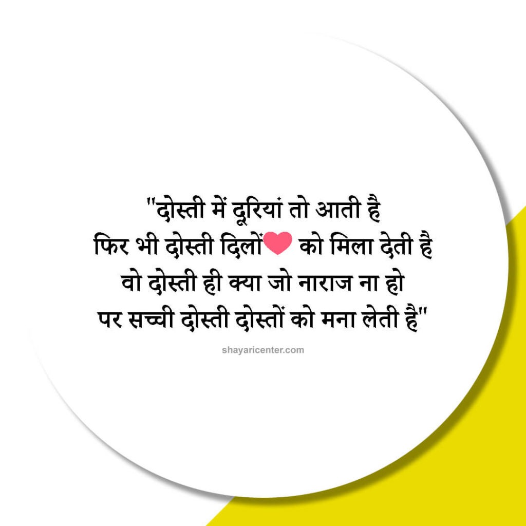 दोस्ती में दूरियां तो आती है फिर भी दोस्ती दिलों को मिला देती है वो दोस्ती ही क्या जो नाराज ना हो पर सच्ची दोस्ती दोस्तों को मना लेती है