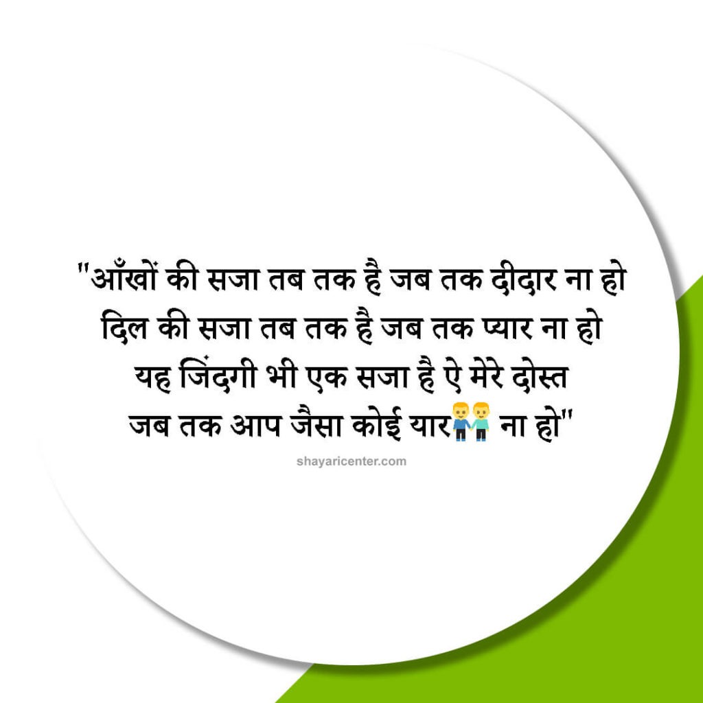 आँखों की सजा तब तक है जब तक दीदार ना हो दिल की सजा तब तक है जब तक प्यार ना हो यह जिंदगी भी एक सजा है ऐ मेरे दोस्त जब तक आप जैसा कोई यार ना हो