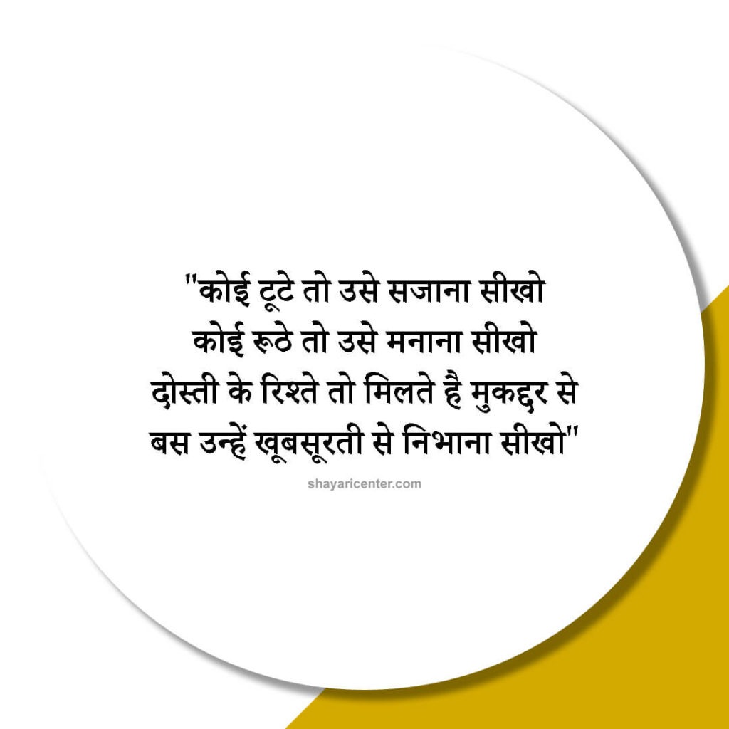 कोई टूटे तो उसे सजाना सीखो कोई रूठे तो उसे मनाना सीखो दोस्ती के रिश्ते तो मिलते है मुकद्दर से बस उन्हें खूबसूरती से निभाना सीखो