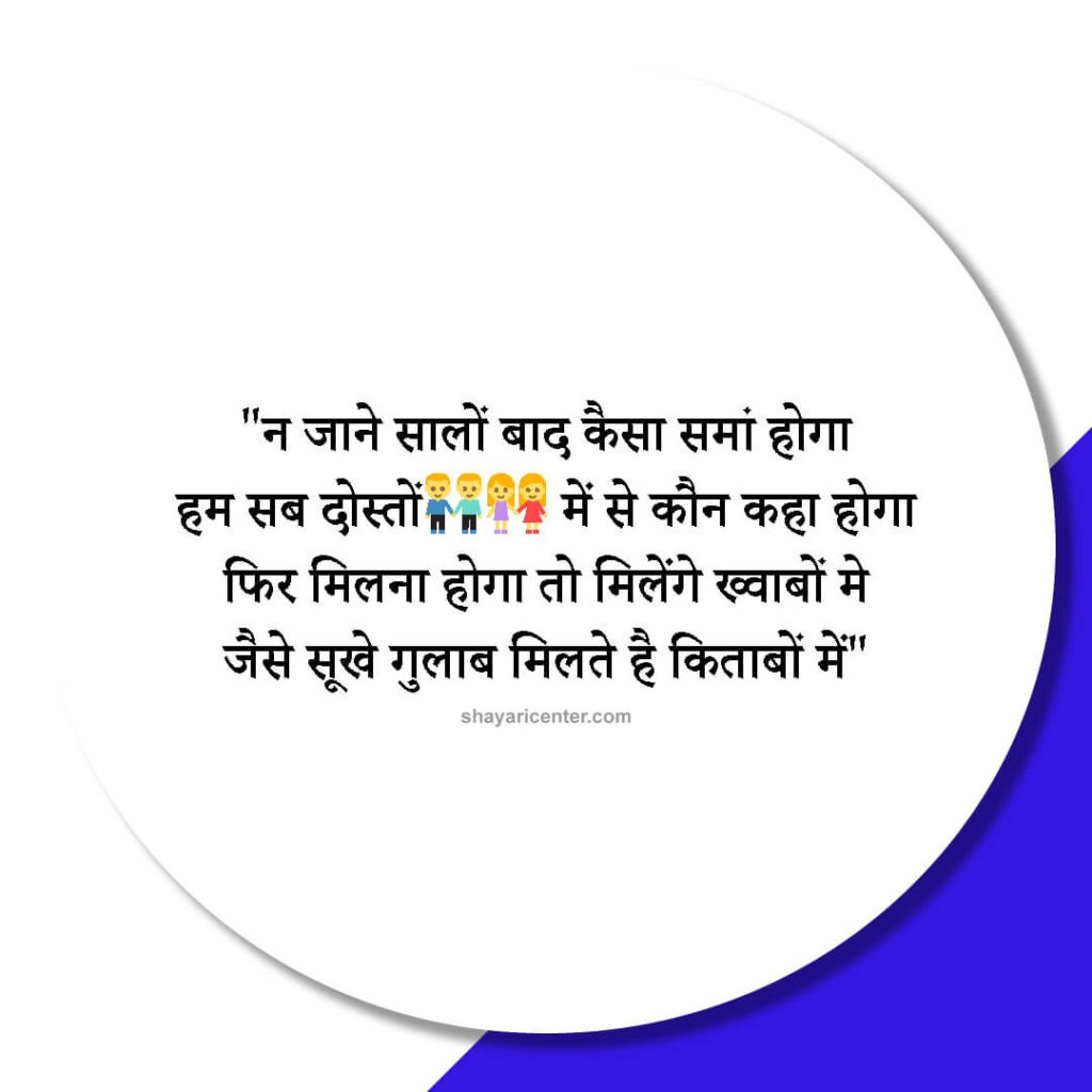 न जाने सालों बाद कैसा समां होगा हम सब दोस्तों में से कौन कहा होगा फिर मिलना होगा तो मिलेंगे ख्वाबों मे जैसे सूखे गुलाब मिलते है किताबों में