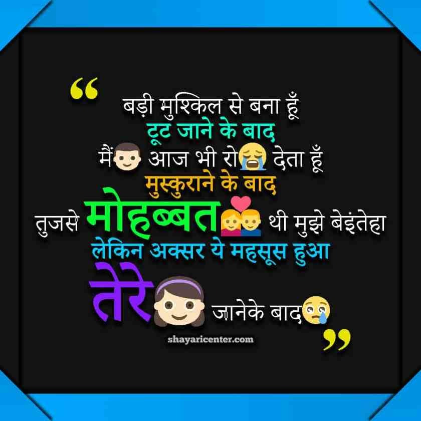 बड़ी मुश्किल से बना हूँ टूट जाने के बाद मैं आज भी रो देता हूँ मुस्कुराने के बाद तुजसे मोहब्बत थी मुझे बेइंतेहा लेकिन अक्सर ये महसूस हुआ तेरे जानेके बाद