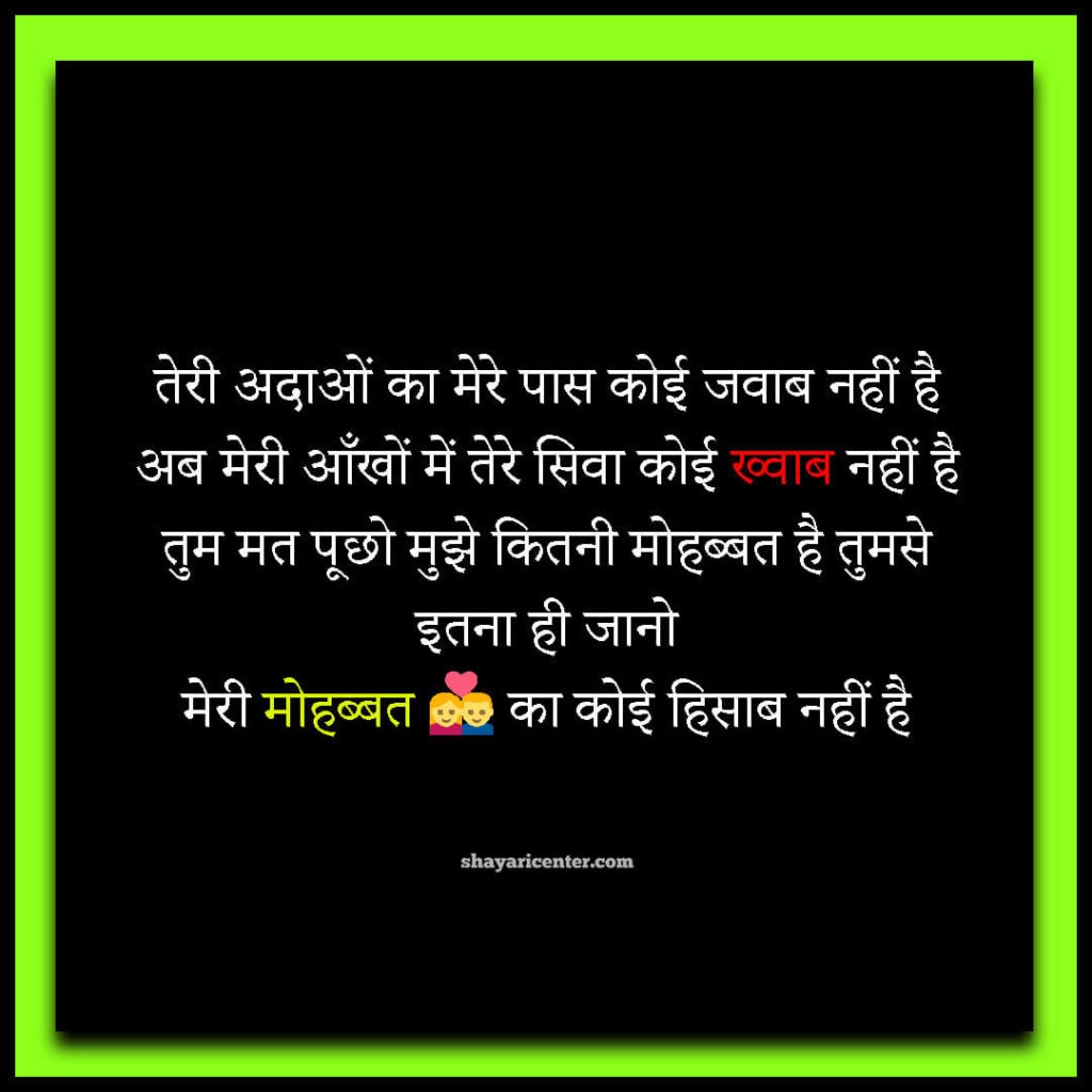 तेरी अदाओं का मेरे पास कोई जवाब नहीं है अब मेरी आँखों में तेरे सिवा कोई ख्वाब नहीं है तुम मत पूछो मुझे कितनी मोहब्बत है तुमसे इतना ही जानो मेरी मोहब्बत का कोई हिसाब नहीं है
