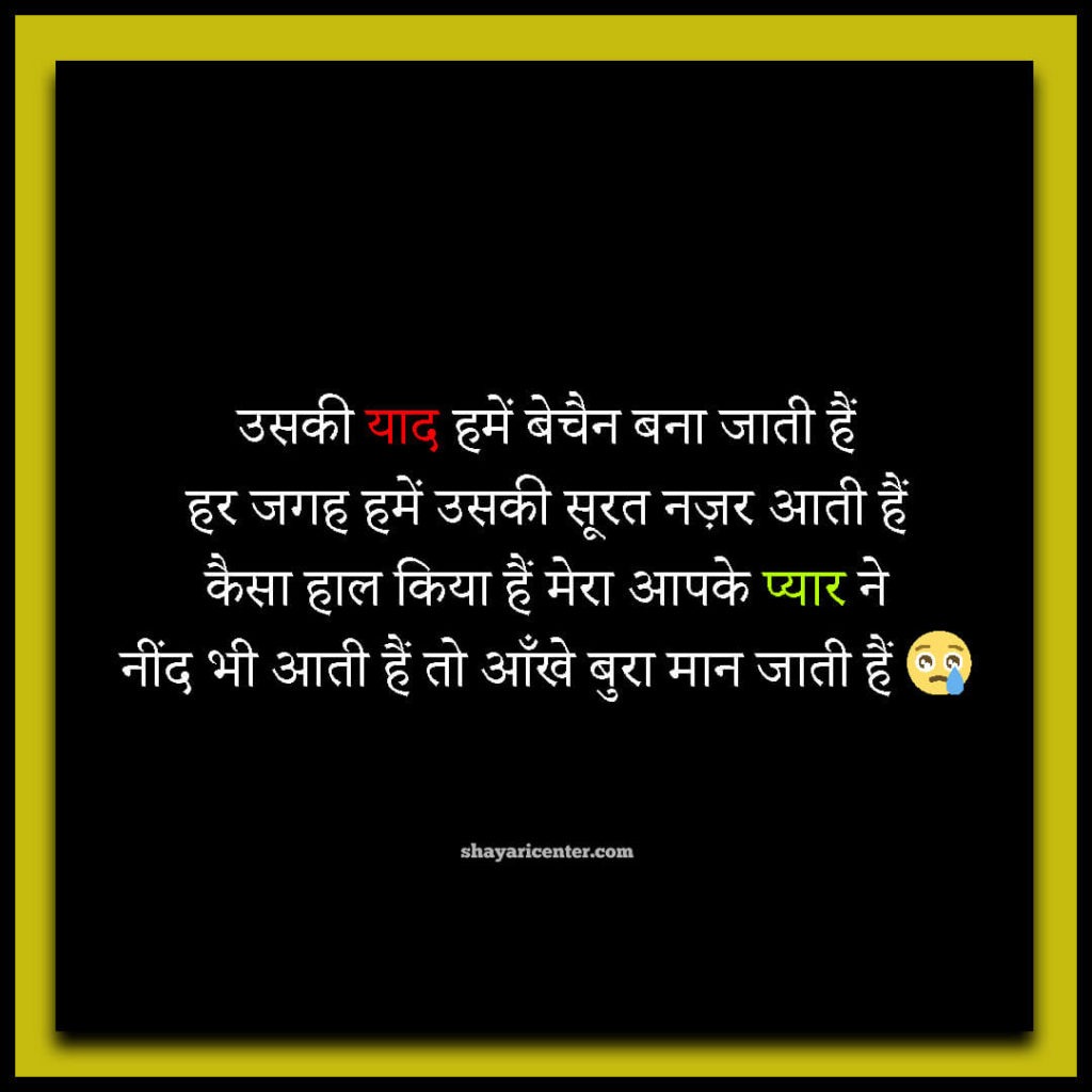 उसकी याद हमें बेचैन बना जाती हैं हर जगह हमें उसकी सूरत नज़र आती हैं कैसा हाल किया हैं मेरा आपके प्यार ने नींद भी आती हैं तो आँखे बुरा मान जाती हैं