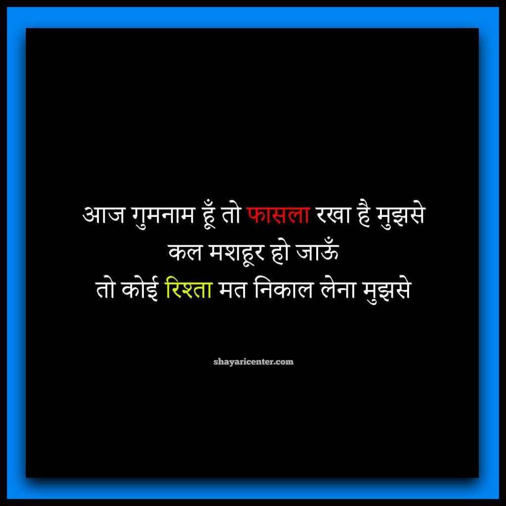 आज गुमनाम हूँ तो फासला रखा है मुझसे कल मशहूर हो जाऊँ तो कोई रिश्ता मत निकाल लेना मुझसे boys attitude status in hindi