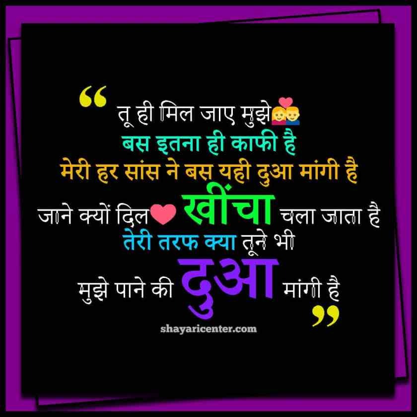 तू ही मिल जाए मुझे बस इतना ही काफी है मेरी हर सांस ने बस यही दुआ मांगी है जाने क्यों दिल खींचा चला जाता है तेरी तरफ क्या तूने भी मुझे पाने की दुआ मांगी है